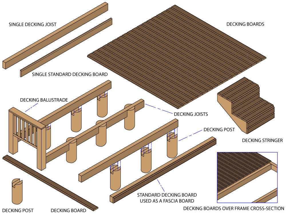 The diagram below illustrates the various components and parts that make up a timber deck.